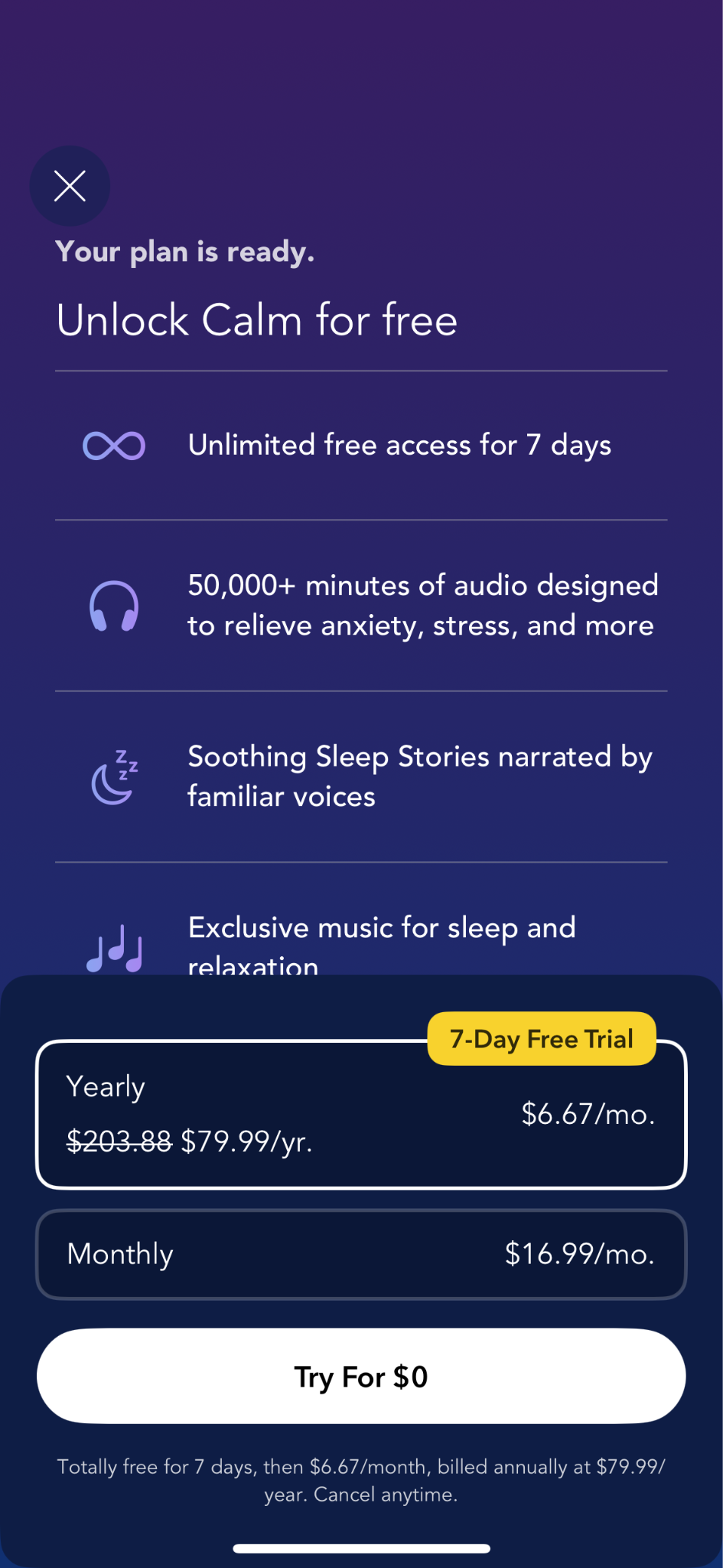 Calm Premium (Annual): $69.99 - $79.99 per year after a 7-day free trial. This unlocks the complete library of guided meditations, all Sleep Stories (with new ones added weekly), exclusive music, Masterclasses, Calm Body sessions, and the Daily Calm archive.