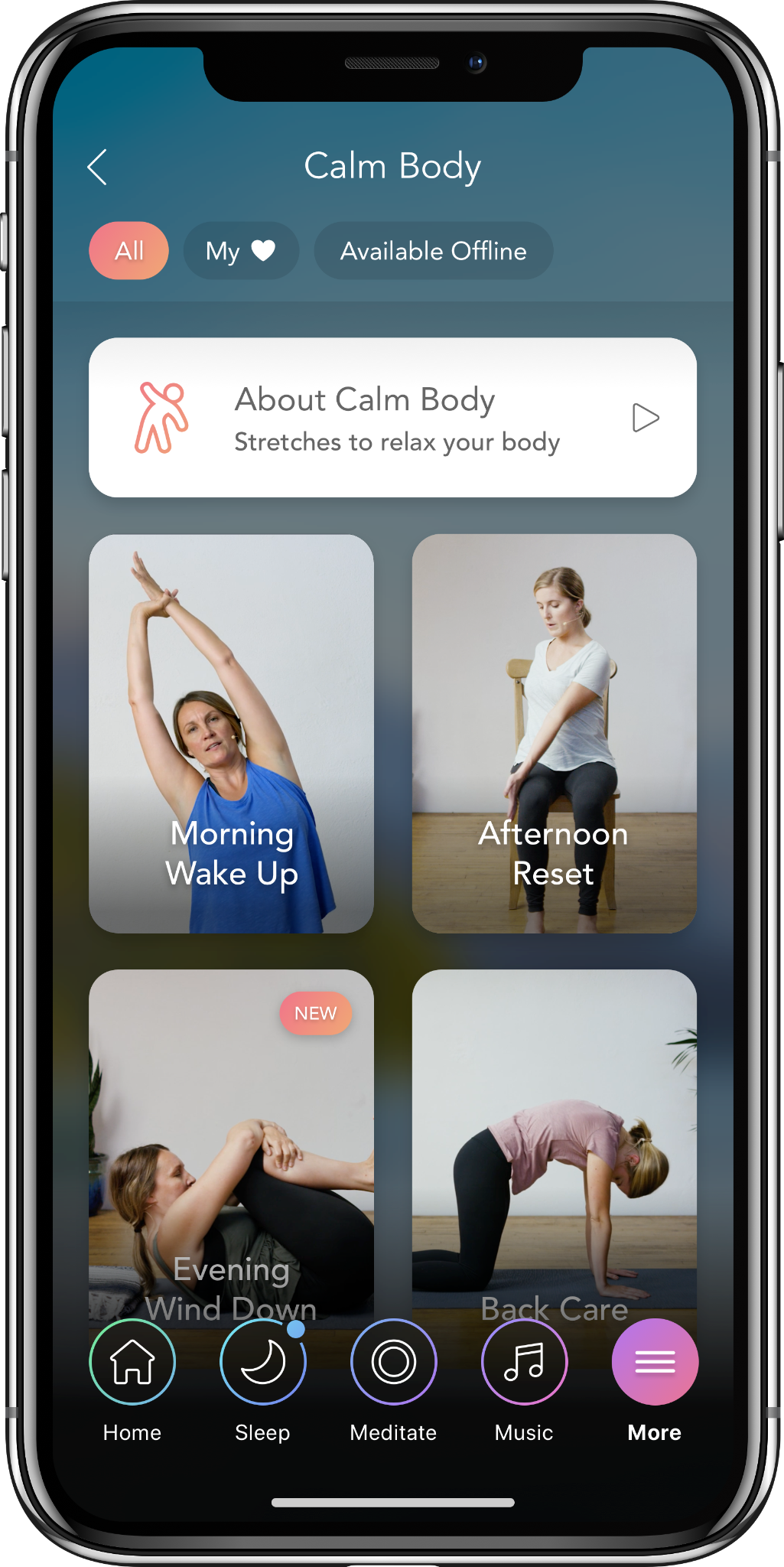 The “Movement” section (also called “Calm Body”) offers approximately 10-minute guided video sessions of gentle stretching and mindful movement. Sessions are organized by time of day: Morning Wake Up, Afternoon Reset, Evening Wind Down, and specific targets like Back Care. The exercises are designed to be accessible to all fitness levels.