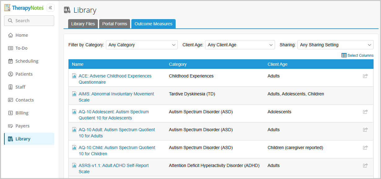 Limited Clinical Innovation Features: Although TherapyNotes includes an Outcome Measures library and Insights visualization tab, the implementation remains basic compared to platforms designed around continuous clinical improvement.