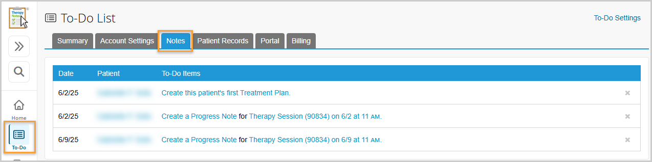 TherapyNotes centers around its automated To-Do List system, which serves as a command center for practice operations.