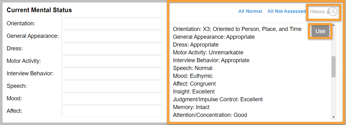 Each template combines dropdown menus, checkboxes, and text fields to balance efficiency with depth. The Quick History Review function allows clinicians to retrieve information from previous notes, while new progress notes can be auto-filled with content from the last session. The system includes searchable DSM-5 diagnosis integration, with previous codes copied into new notes automatically.