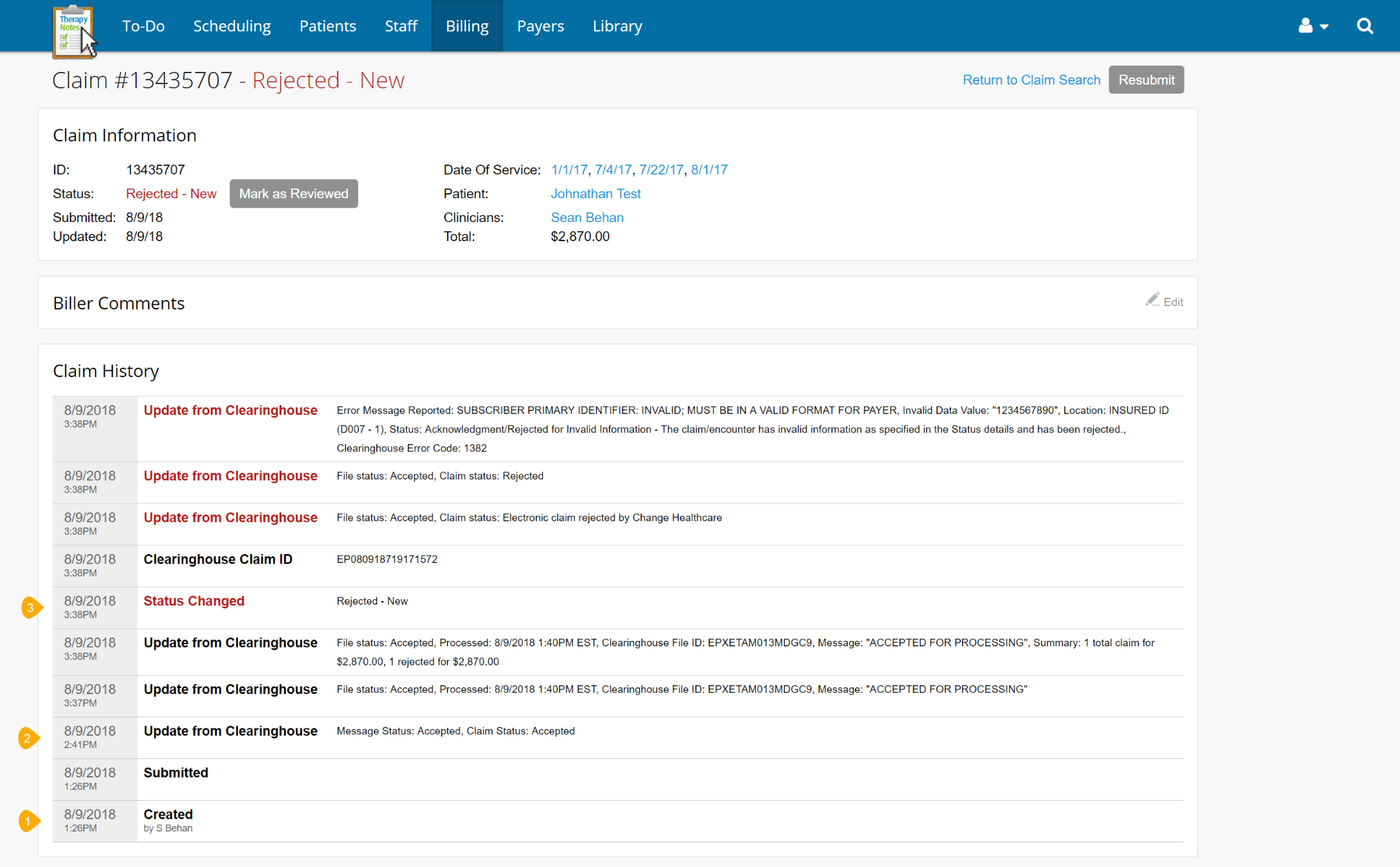 When a clinician signs a note containing a CPT code, the system automatically posts charges to the patient account and queues the corresponding insurance claim for review and submission. The claim scrubbing feature, provided through the clearinghouse partner, checks for common errors before submission, thereby reducing rejection rates.